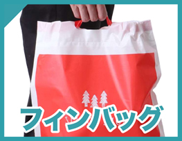 フィンバッグ![]() | 袋に内蔵されたテープを軽く引いて持ち手にするポリ製の手提げ袋。 他のハンドル付きの袋に比べてかさばらず、取っ手を強く引けば巾着袋のようにもなります。 持ち帰り用として和洋菓子店や惣菜・お弁当屋さん、アパレルショップまで幅広く利用されています |