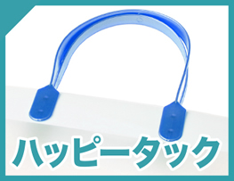 ハッピータック![]() | 『ハッピータック』と呼ばれるプラスチックの持ち手を使用した手提げ袋。 従来の袋の強度に加え、台紙を入れる事で重量物にも耐えられる強度を持たせることが出来ます。 |