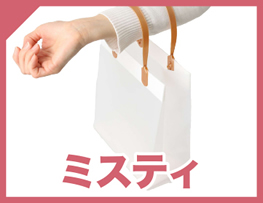 ミスティー(ループハンドル角底ポリ袋)![]() | 見た目は紙袋!角底ポリ袋のお買い得タイプです。 紙袋の形状で材質は頑丈なポリエチレンです。角底加工をしているので自立性があり、高級感もあります。 また、紙袋に比べて耐水性にも優れているため、雨や水に濡れても安心! コスト面においても紙袋と同等以下でお作りすることができます。 |